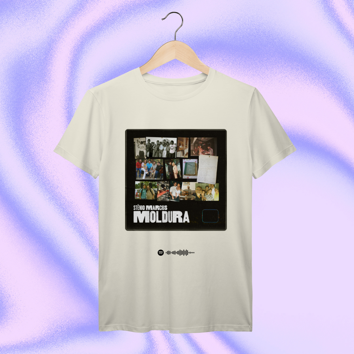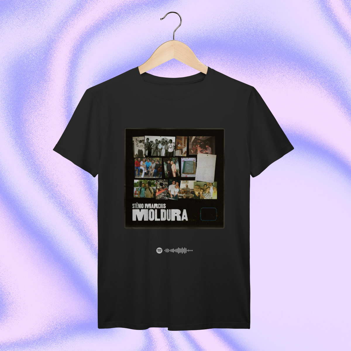 Esta camiseta traz a capa do álbum Moldura, uma das obras mais marcantes de Stênio Marcius, e apresenta também o código Spotify, permitindo ouvir o álbum diretamente ao aproximar o celular.