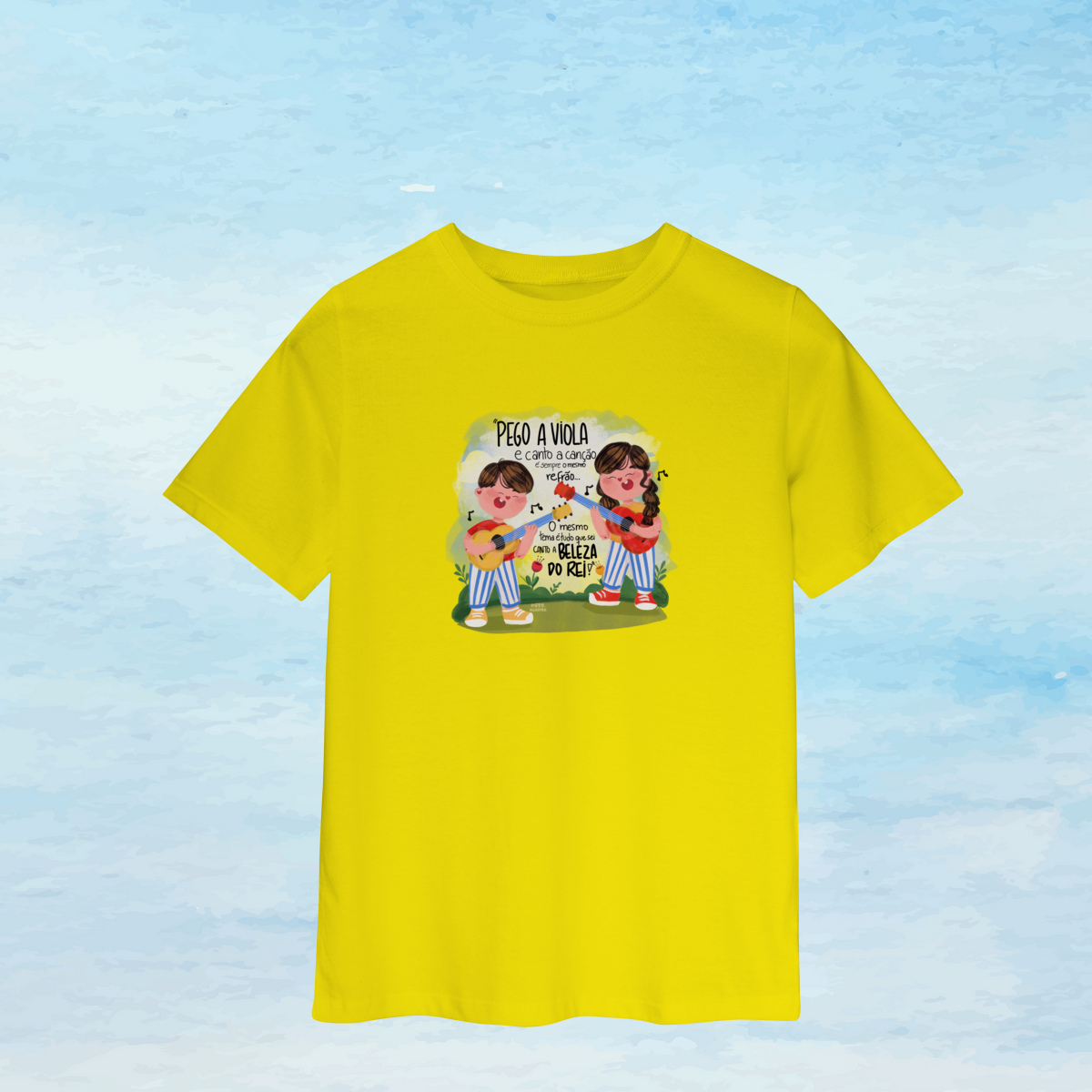 Inspirada na canção “Pego a Viola”, esta camiseta infantil carrega a beleza simples e profunda das composições de Stênio Marcius — expressando fé, alegria e amor desde a infância.
