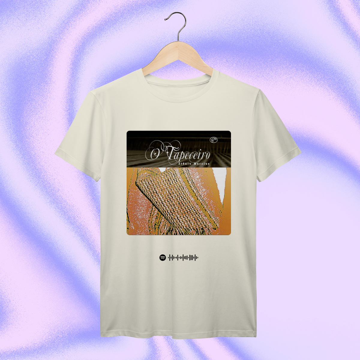 Esta camiseta traz a capa do álbum O Tapeceiro, uma das obras mais marcantes de Stênio Marcius, e apresenta também o código Spotify, permitindo ouvir o álbum diretamente ao aproximar o celular.
