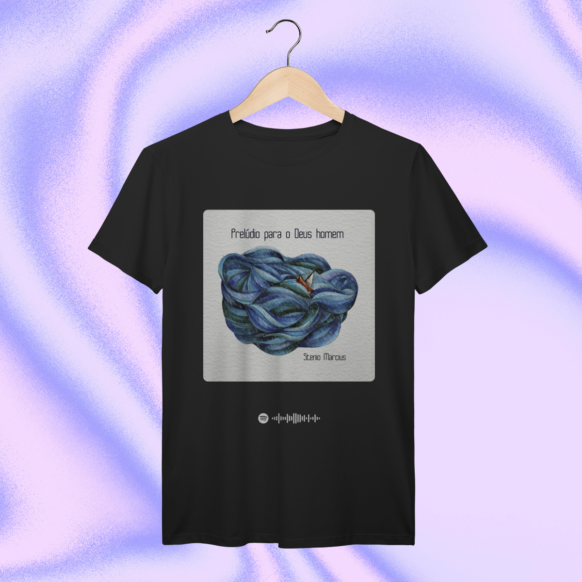 Esta camiseta traz a capa do álbum Prelúdio para o Deus Homem, uma das obras mais marcantes de Stênio Marcius, e apresenta também o código Spotify, permitindo ouvir o álbum diretamente ao aproximar o celular.